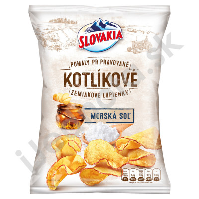 Slovakia Kotlíkové zemiakové lupienky sú pozvoľna smažené, príjemne chrumkavé s jemnou chuťou morskej soli. Vyberáme vhodné odrody zemiakov, ktoré po dôkladnom očistení nakrájame ešte v šupke na hrubé a veľké plátky. Tie pozvoľna a dozlatista smažíme v oleji. Výsledkom sú výnimočne chrumkavé zemiakové lupienky ochutené morskou soľou.Značka
